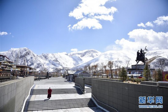 一名僧人在青海省玉樹藏族自治州玉樹市格薩爾廣場旁走過地下通道(4月6日攝)。 新華社記者 吳剛 攝