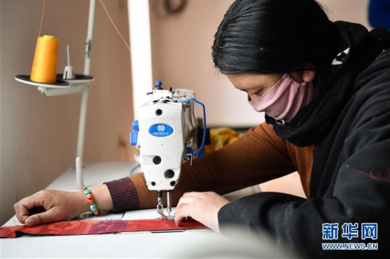 在青海省玉樹藏族自治州加吉娘社區(qū)民族服飾加工車間,當(dāng)?shù)啬撩袼髂峡醋吭诳p制布飾(4月3日攝)。新華社記者 張龍 攝