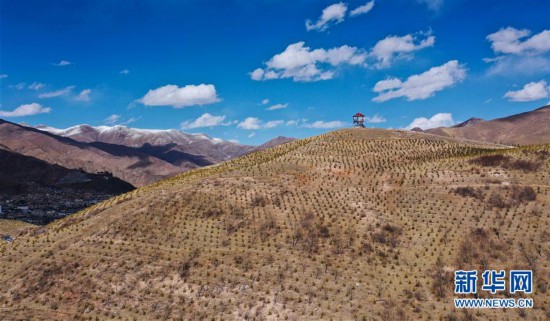 這是4月11日拍攝的青海省玉樹藏族自治州玉樹市境內(nèi)的樹木(無人機(jī)照片)。 新華社記者 薛玉斌 攝