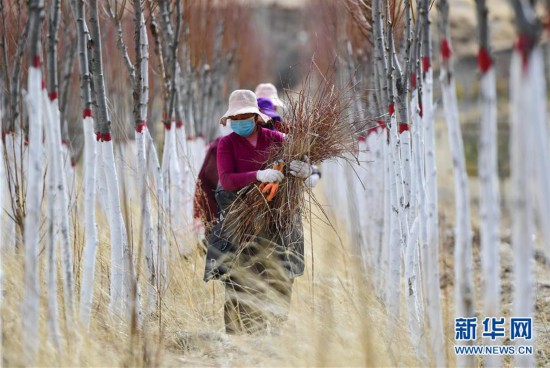 在青海省玉樹藏族自治州高原千畝林木良種繁育實驗基地,當(dāng)?shù)厝罕娫谇謇硇藜暨^的樹枝(3月29日攝)。新華社記者 張龍 攝