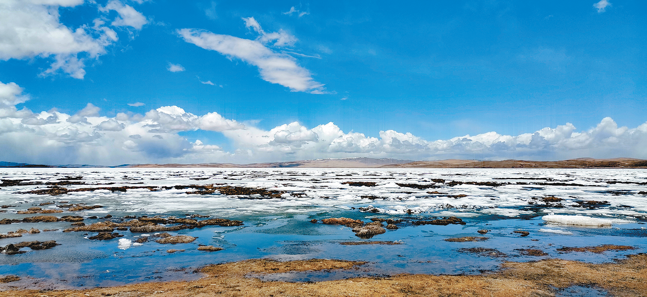 一路走一路看,看黃河鄉(xiāng)的山水草原,看生活在草原上的生靈,不一會,天空飄起了雪花,遠遠看見一個非常大的湖泊,冰面還未解凍,低沉的云連接著遠處湖泊的冰面。湖泊的周邊是一個個小湖,湖水已經解凍,用望遠鏡望去,可以看到湖邊上幾只黑頸鶴在閑庭信步。