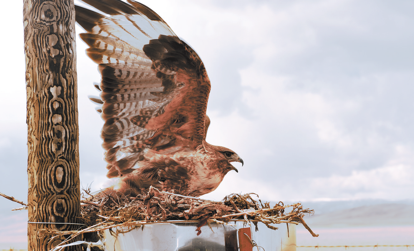 我搖下車窗,看到一根豎著的桿子,桿子的中間是一個鷹巢,一只鷹緊緊地盯著我,而我和鷹的距離就一米多。我是第一次如此近距離看草原上的鷹,它的眼睛犀利有神,和在動物園或者籠子里看到的鷹有天壤之別,以至于看得出神忘記了拍照。當我舉起相機準備拍照時,它已展開翅膀飛走了。