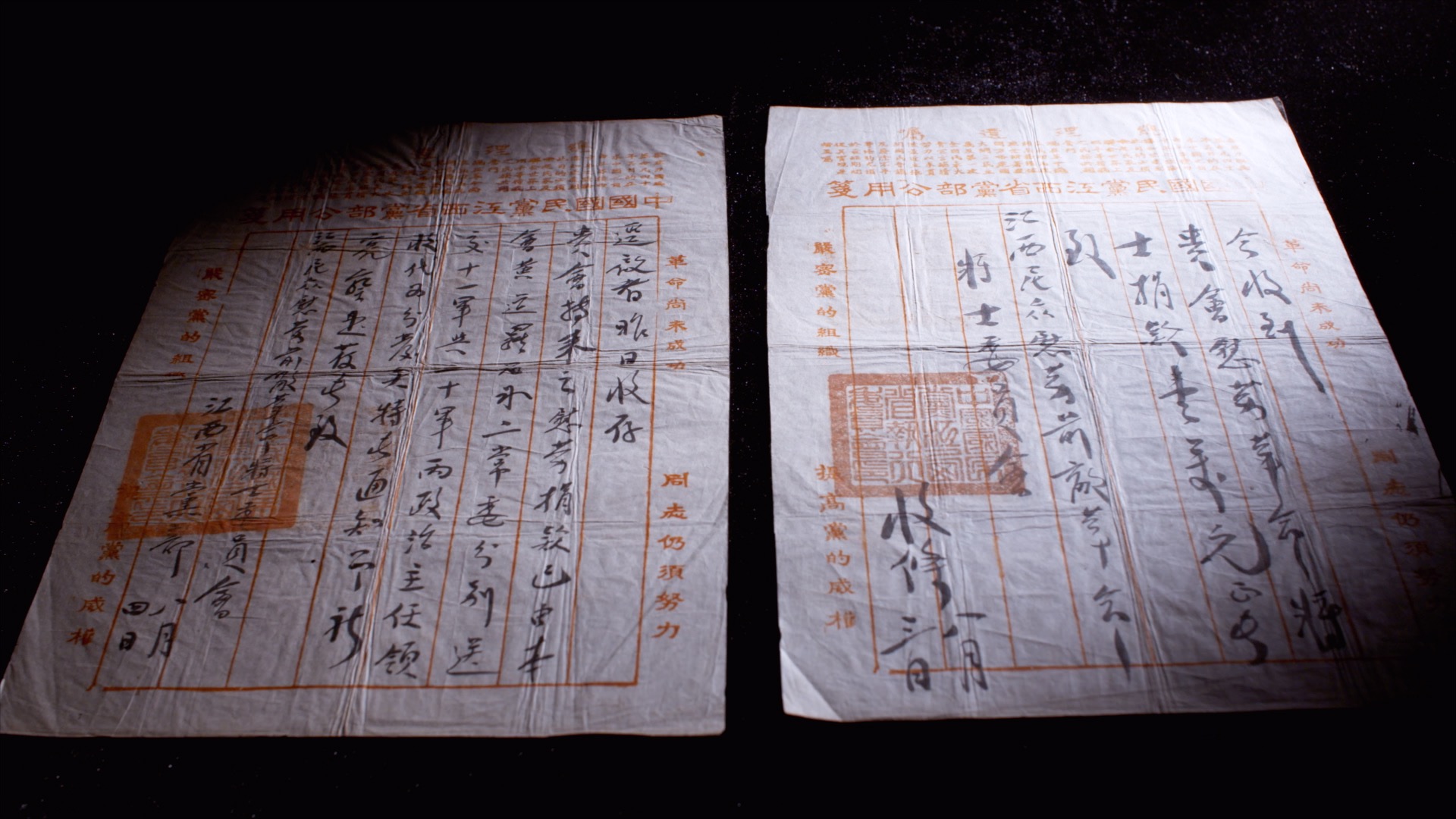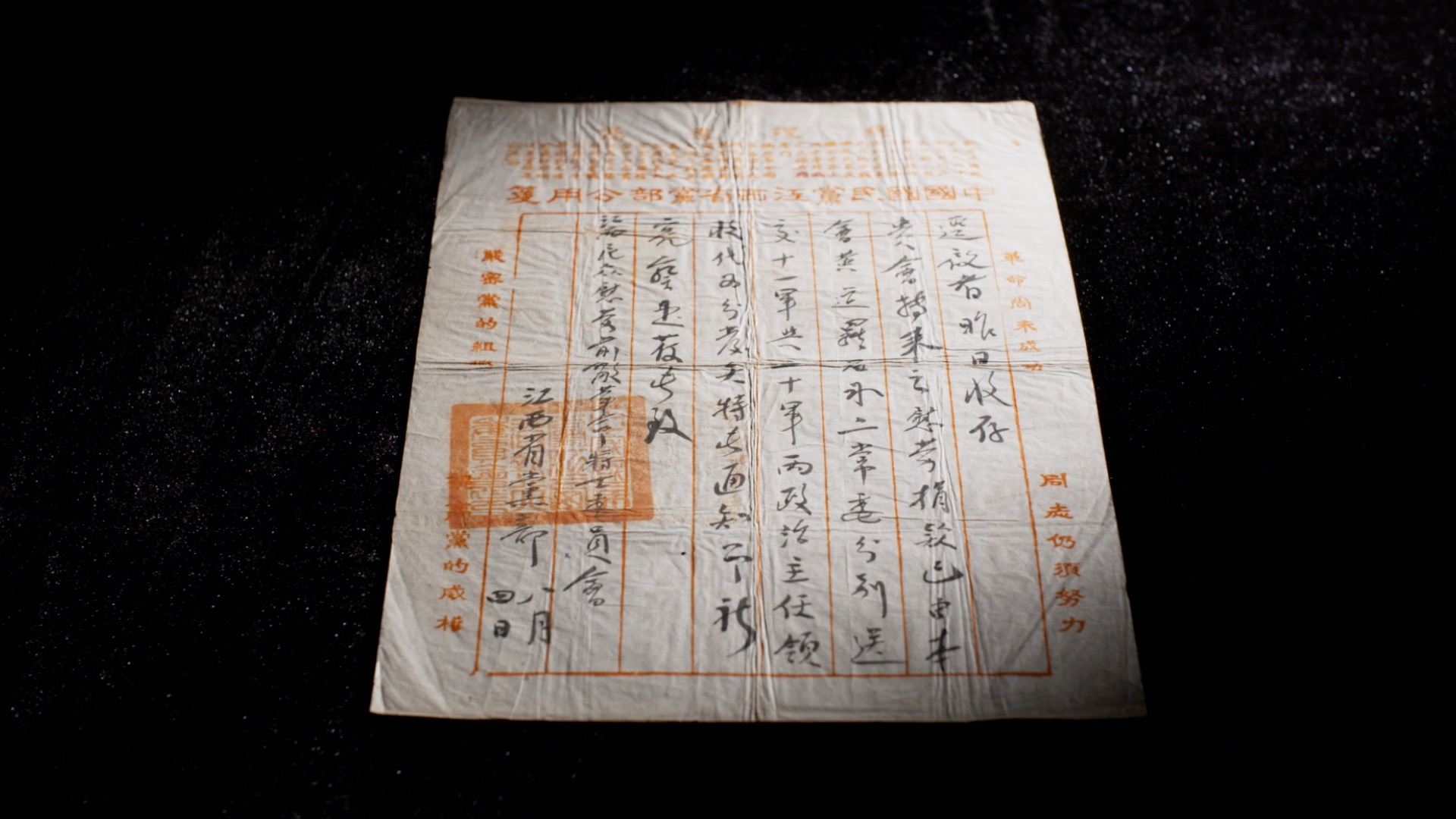 劉小花(南昌八一起義紀念館 陳列保管部主任):這兩件文物是當時江西民眾慰勞起義軍將士捐款的收條和回信,是1958年5月入藏到我館的,現在是國家一級文物。這兩件文物采用的是統(tǒng)一印刷的公文信箋,為“明八行”信紙,信箋的最上端有總理遺囑,往下就是“中國國民黨黨部公用箋”幾個字。