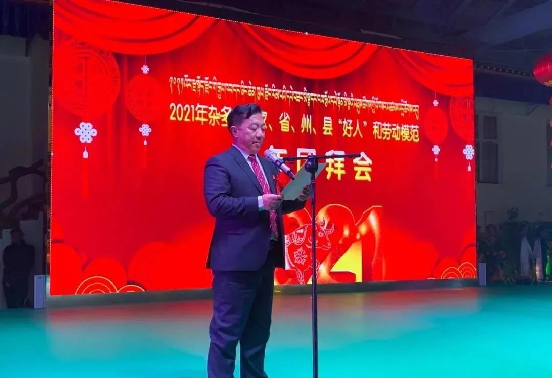 1月1日,雜多縣在縣高原現(xiàn)代科技生態(tài)園隆重舉辦2021年國家、省、州、縣“好人”和勞動模范新年團拜會。州委常委、縣委書記才旦周出席并致新年賀詞。