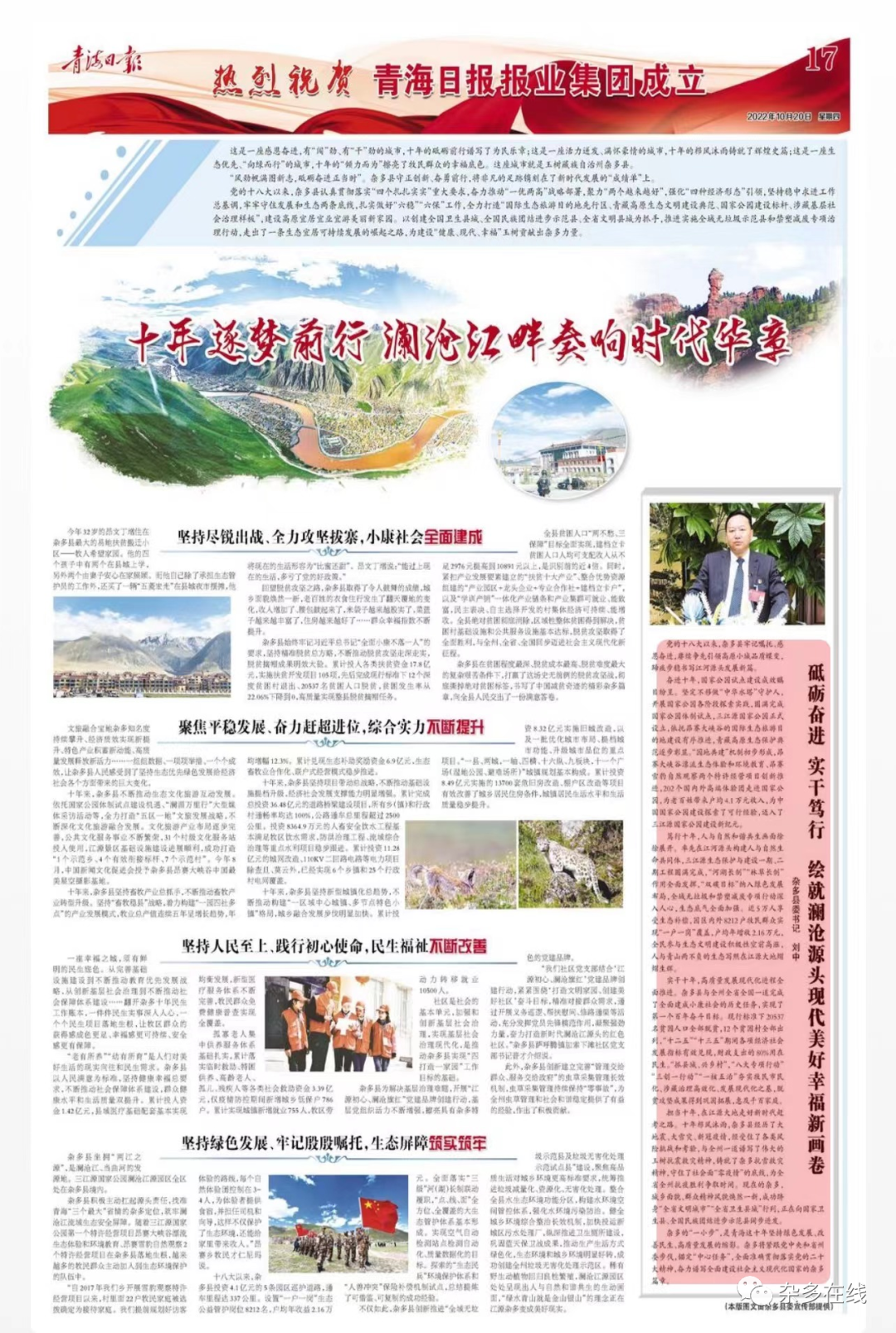 擔(dān)當(dāng)十年,在江源大地走好新時(shí)代趕考之路。十年櫛風(fēng)沐雨,雜多縣經(jīng)歷了大地震、大雪災(zāi)、新冠疫情,經(jīng)受住了各類風(fēng)險(xiǎn)挑戰(zhàn)和考驗(yàn),與全州一道譜寫了偉大的玉樹抗震救災(zāi)精神,鑄就了雜多抗雪救災(zāi)精神,守住了社會面“零疫情”的底線,為全省全州抗疫勝利爭取時(shí)間?,F(xiàn)在的雜多,城鄉(xiāng)面貌、群眾精神風(fēng)貌煥然一新,成功躋身“全省文明城市”“全省衛(wèi)生縣城”行列,正在向國家衛(wèi)生縣、全國民族團(tuán)結(jié)進(jìn)步示范縣闊步進(jìn)發(fā)。