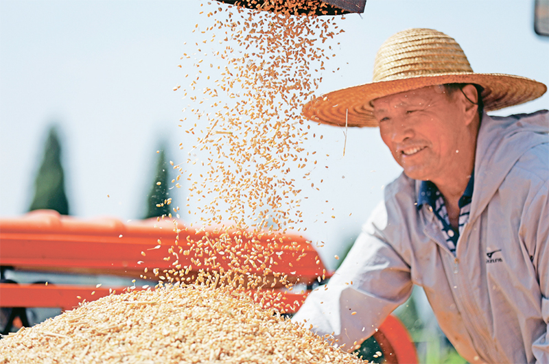2024年,全国粮食总产量14130亿斤,在连续9年稳定在1.3万亿斤以上的基础上,首次迈上1.4万亿斤新台阶。图为2024年5月25日山东省郯城县山南头村村民将收获的小麦装车。新华社发 张春雷/摄