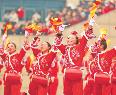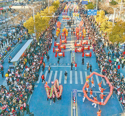 江苏海安市举行“龙腾狮跃贺新春”巡游展演活动,文化志愿者表演传统民俗节目。翟慧勇摄(人民视觉)