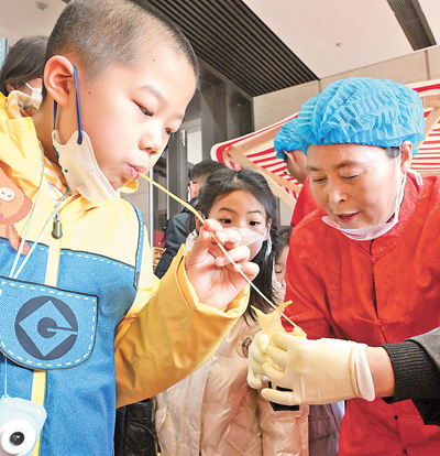 北京中国非物质文化遗产馆,小朋友在“过年——春节主题展”上体验吹糖人。新华社记者  李  贺摄