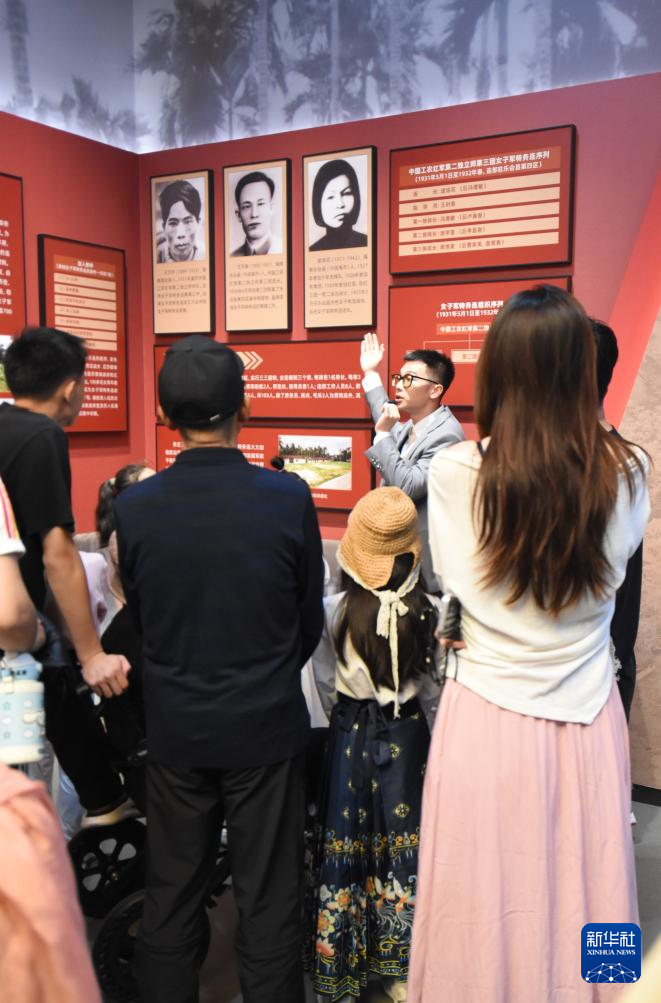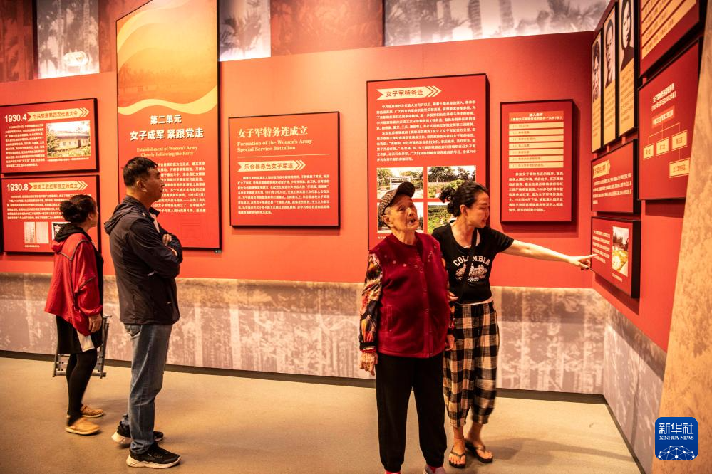讲解员为游客讲解红色娘子军革命事迹。新华社记者刘邓 摄