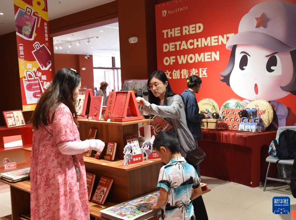 游客在红色娘子军纪念园内挑选“小琼花”文创产品。新华社记者刘邓 摄