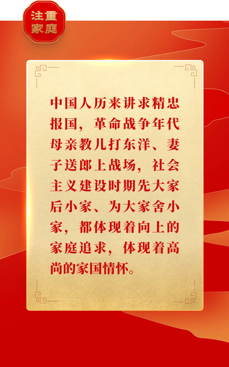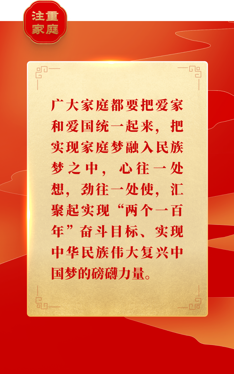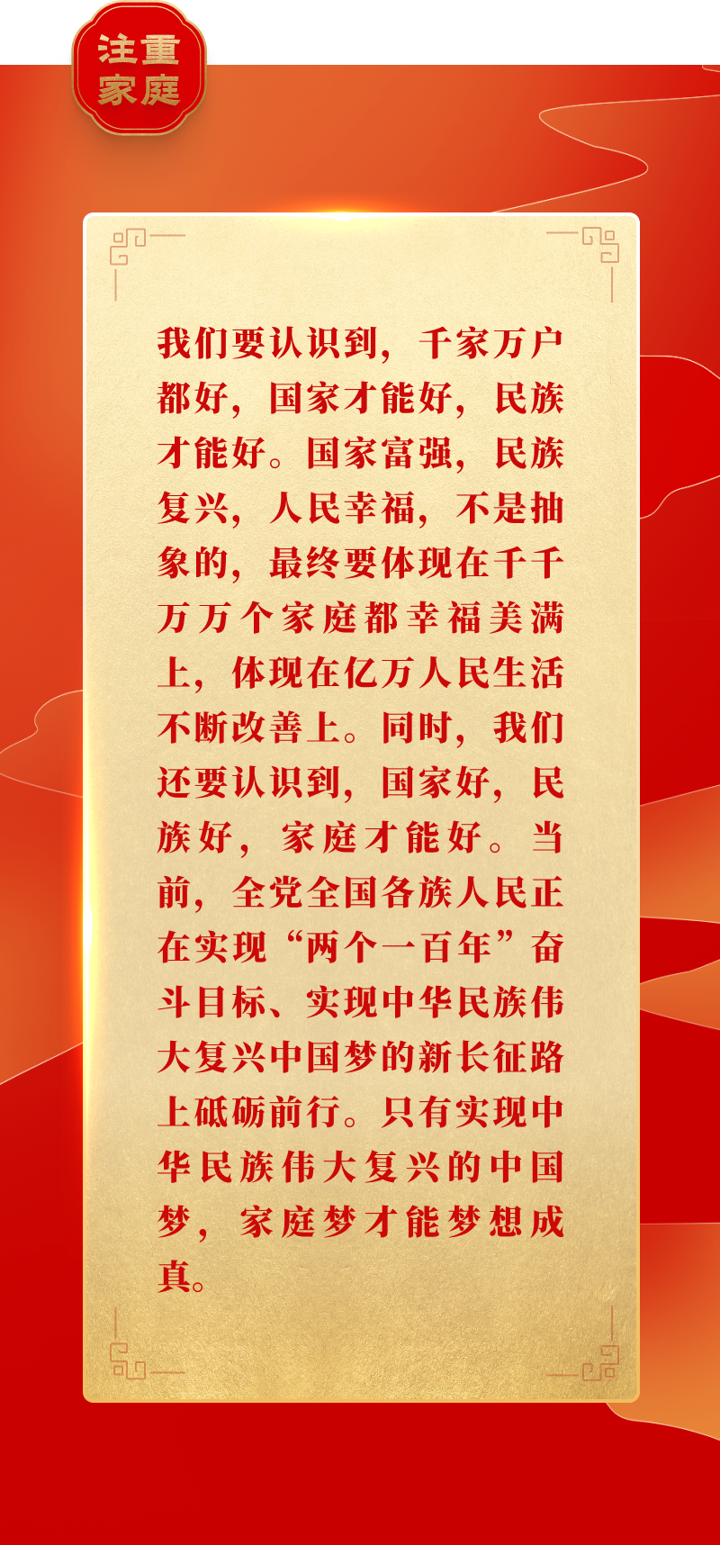 “家庭和睦则社会安定,家庭幸福则社会祥和,家庭文明则社会文明。”“家庭的前途命运同国家和民族的前途命运紧密相连。”