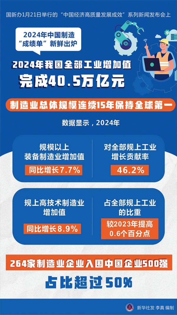 国务院新闻办公室于2025年1月21日举行“中国经济高质量发展成效”系列新闻发布会,介绍了2024年中国制造“成绩单”:2024年我国全部工业增加值完成40.5万亿元,制造业总体规模连续15年保持全球第一。 新华社发 李真/编制