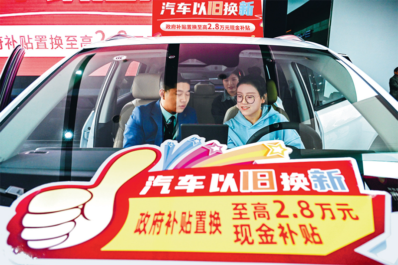 提振消费是扩大内需的重要举措。随着汽车“以旧换新”补贴政策实施,汽车消费市场火热,成为拉动消费增长的重要引擎,其中新能源汽车成为消费亮点,众多车企推出优惠补贴叠加国家补贴政策,优惠力度进一步加大。图为2024年10月23日,市民在江西省南昌市一4S店内现场咨询。 人民图片 鲍赣生/摄
