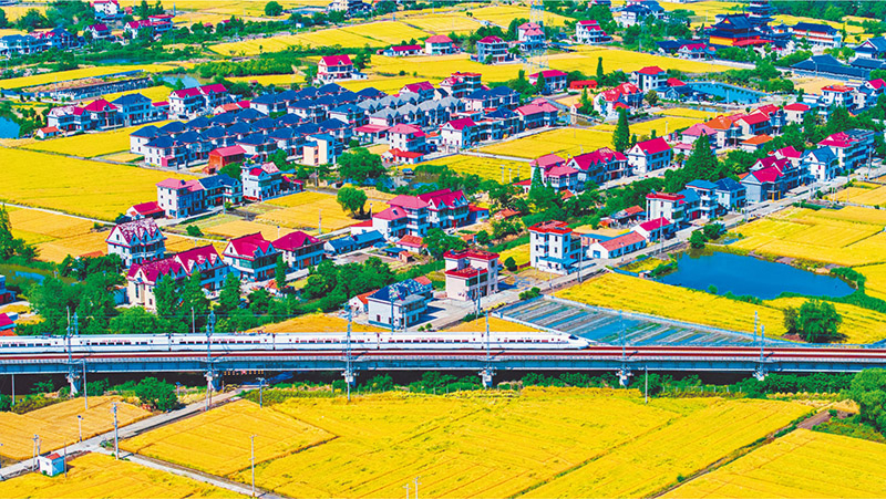 江苏学习运用“千万工程”经验,高质量完成1.1万个村庄规划。图为2025年5月21日,列车驶过南通市通州区平潮镇麦田,金黄色的麦田、多彩的民居与飞驰的列车相映成景,构成一幅田园丰收画卷。 江苏省委宣传部供图 翟慧勇/摄