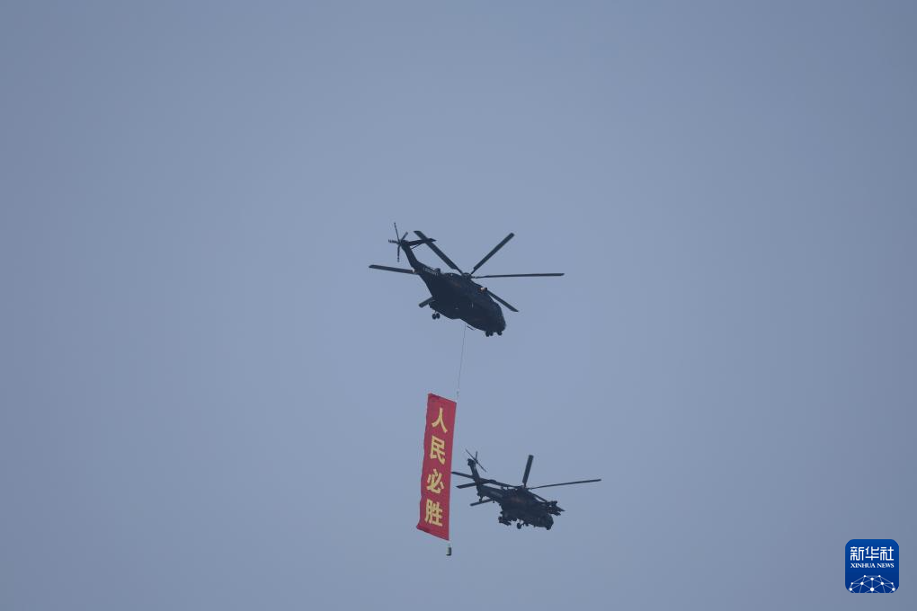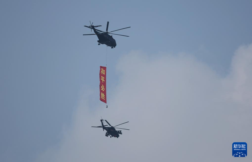 9月3日,纪念中国人民抗日战争暨世界反法西斯战争胜利80周年大会在北京隆重举行。这是空中护旗梯队飞过天安门广场上空,26架直升机汇成巨大的“80”字样。