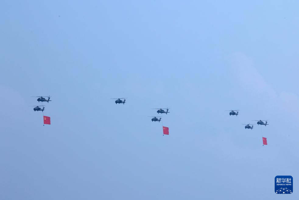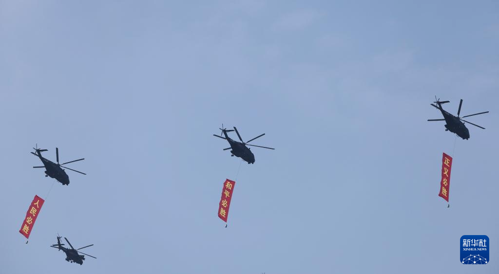 9月3日,纪念中国人民抗日战争暨世界反法西斯战争胜利80周年大会在北京隆重举行。这是空中护旗梯队通过天安门广场。