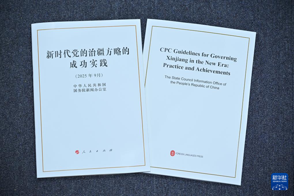 9月19日,国务院新闻办公室在北京举行新闻发布会,发布《新时代党的治疆方略的成功实践》白皮书,中央宣传部副部长王纲,新疆维吾尔自治区党委副书记、自治区主席艾尔肯·吐尼亚孜,新疆维吾尔自治区党委常委、自治区常务副主席陈伟俊,新疆维吾尔自治区党委常委、宣传部部长王建新出席,介绍白皮书有关情况并答记者问。这是《新时代党的治疆方略的成功实践》白皮书。 新华社记者 李鑫 摄