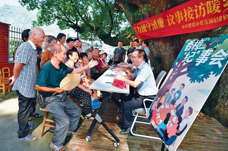 近年来,各地党员、干部深入基层,零距离倾听群众诉求,不断提升信访举报工作质效,整治群众身边的腐败和不正之风。图为2025年8月12日,浙江省建德市莲花镇纪检干部在昴畈村千年古樟树下开展主题为“以莲为镜守清廉 议事接访暖乡情”的接访日活动,认真听取群众反映的情况与问题。 人民图片 宁文武/摄