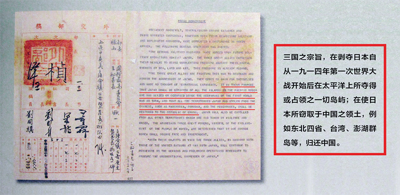1943年,《开罗宣言》宣布,三国之宗旨在使日本所窃取于中国之领土,例如东北四省、台湾、澎湖群岛等,归还中国。1945年,《波茨坦公告》重申“开罗宣言之条件必将实施”。同年9月,日本签署《日本投降书》,承诺“忠诚履行波茨坦公告各项规定之义务”。国际社会公认,这些具有国际法效力的文件为中国收复被日本军国主义掠夺和窃取的领土提供了重要的国际法依据,也是战后国际秩序的重要组成部分。图为《开罗宣言》英文版档案。 中新社供图