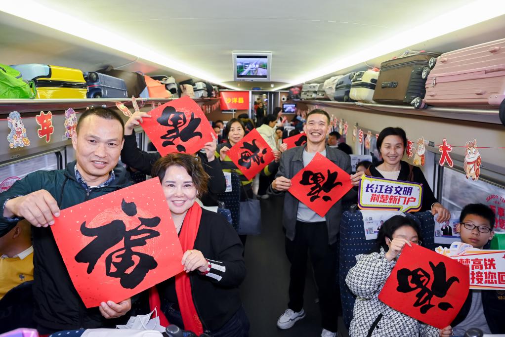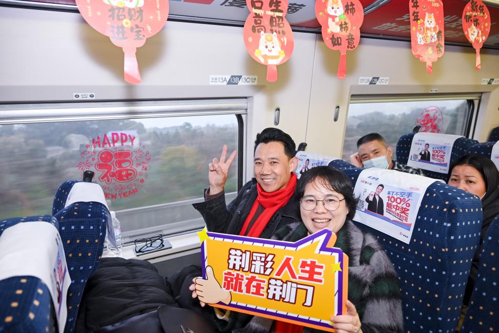 喜庆春联、福字窗花、吉祥灯笼……2月7日,布置一新的G1136次列车,载着800多名在外务工的湖北荆门人从广州启程,一路欢声笑语中,奔赴他们阔别已久的家乡。