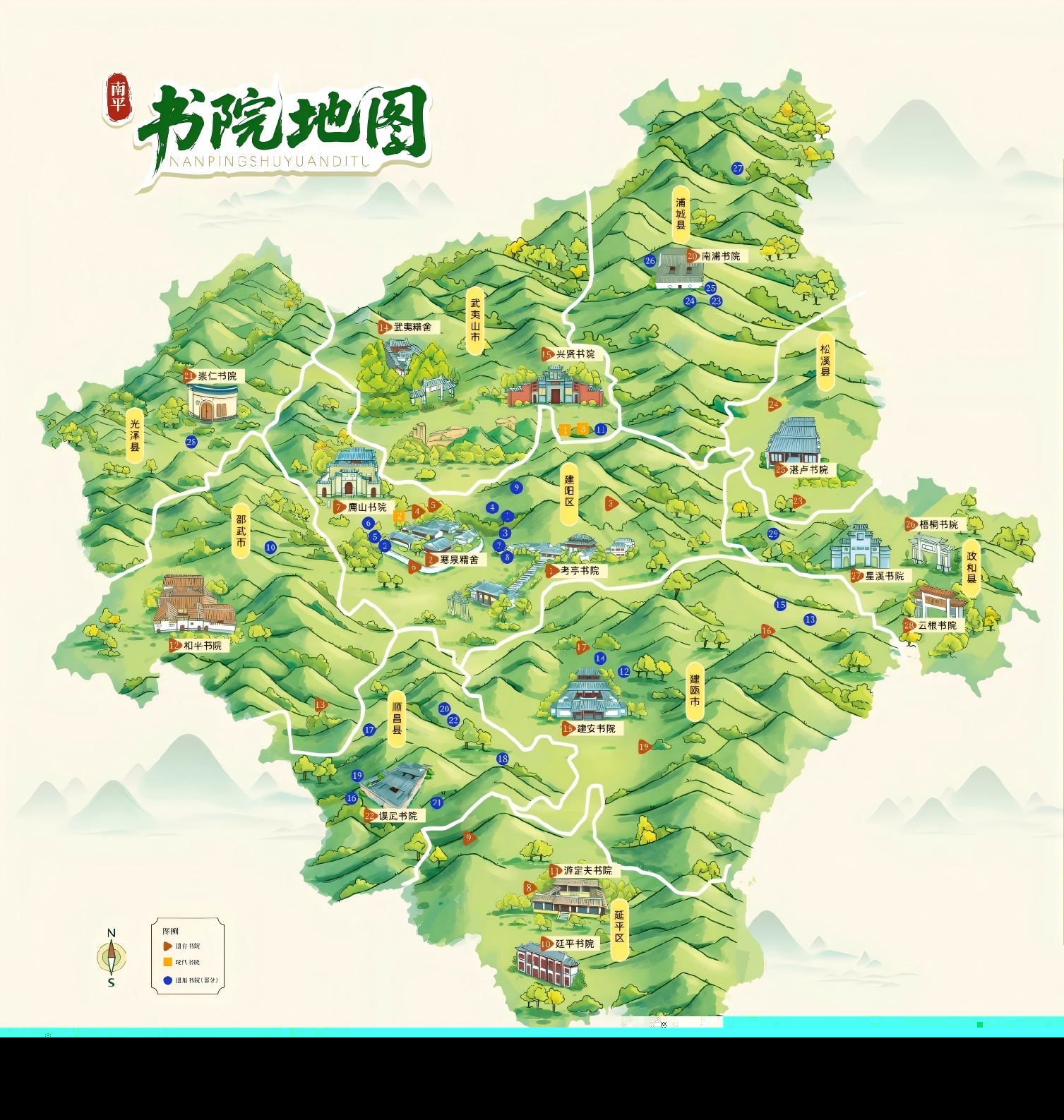 南平历代累计建有书院269所,现存书院及其遗址约30座。图为南平书院地图。 南平市委文明办监制
