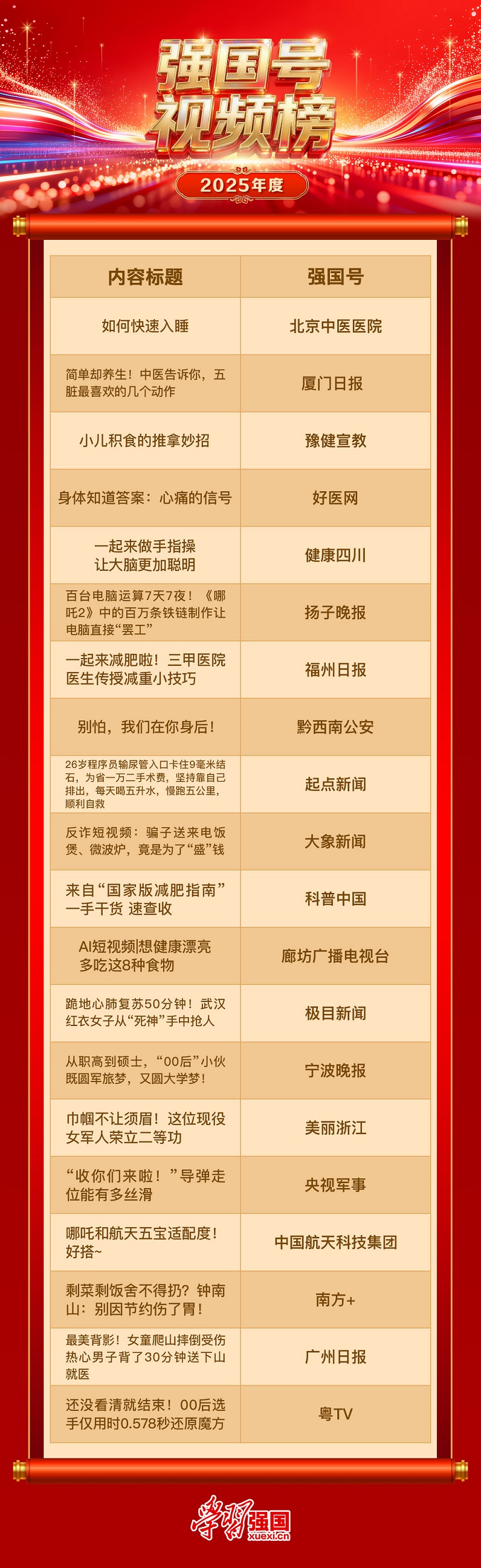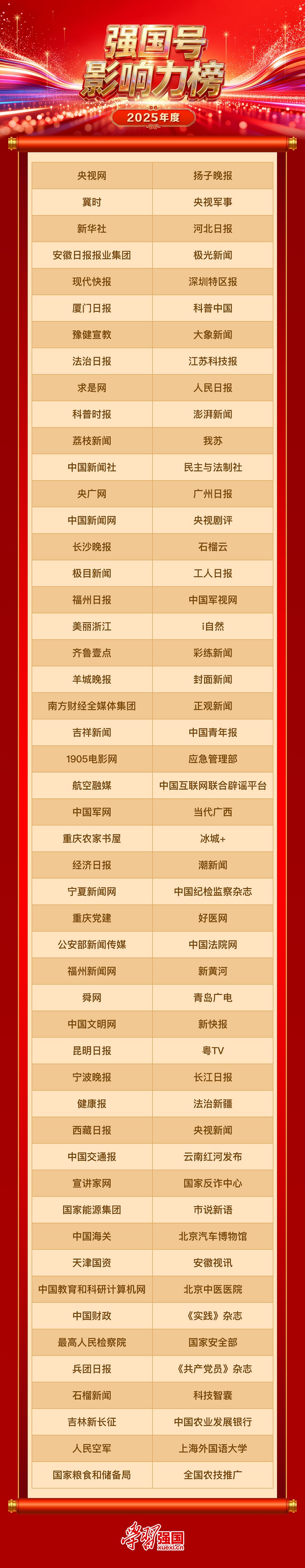 为表彰先进、激发活力,“学习强国”学习平台推出2025年度强国号四大榜单:影响力榜(100家)、新秀榜(10家)、热文榜(20家)、视频榜(20家),向每一位深耕不辍的强国伙伴致以诚挚谢意和敬意!期待各强国号互学互鉴、深耕细作,输出更多有思想、有品质、有新意的作品,共同谱写强国号高质量发展新篇章!