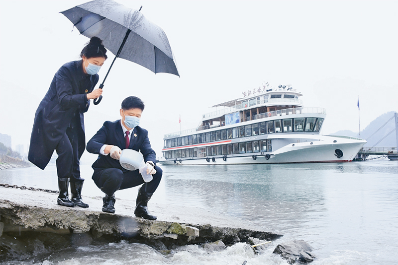 检察公益诉讼作为中国特色社会主义法治体系的重要实践载体,以司法力量守护公共利益、筑牢公正防线。图为2026年3月16日,湖北省宜昌市伍家岗区检察院收到志愿者反映的河道排污线索后,公益诉讼检察部门检察官赶赴现场,对江岸正在排放的污水进行多点位采样取证。 检察日报社供图