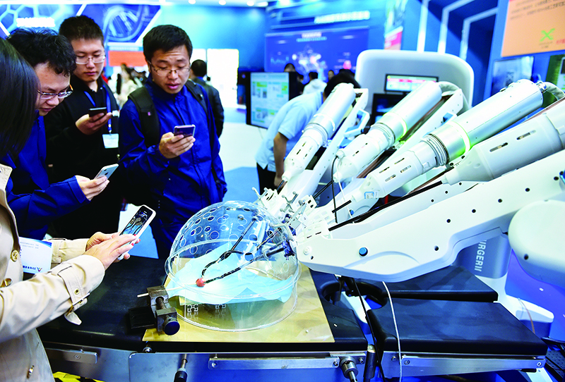 新技術(shù)、新產(chǎn)品的涌現(xiàn)創(chuàng)造源源不斷的市場(chǎng)新需求。圖為觀眾在觀看2018年10月全國(guó)“雙創(chuàng)周”北京會(huì)場(chǎng)主題展展出的一款腔鏡手術(shù)機(jī)器人在做模擬組織縫合手術(shù)。 新華社記者 羅曉光/攝