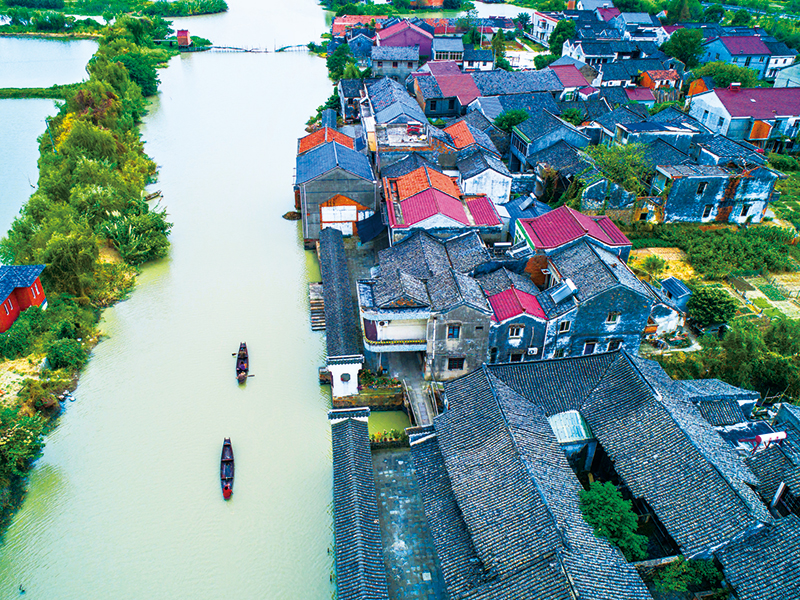 為了保護(hù)古村落,浙江省湖州市東林鎮(zhèn)對(duì)泉家潭村的青石路面、古橋及多處古宅進(jìn)行了修復(fù)改造,水鄉(xiāng)古村成為當(dāng)?shù)孛利愢l(xiāng)村的景觀帶。圖為2018年10月10日,泉家潭村村民劃著小船經(jīng)過(guò)沿河長(zhǎng)廊。 新華社記者 徐昱/攝