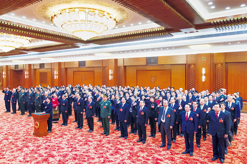 2018年3月18日,十三屆全國(guó)人大一次會(huì)議在北京人民大會(huì)堂舉行第六次全體會(huì)議。圖為新當(dāng)選的第十三屆全國(guó)人民代表大會(huì)常務(wù)委員會(huì)委員進(jìn)行憲法宣誓。 新華社記者 李學(xué)仁/攝