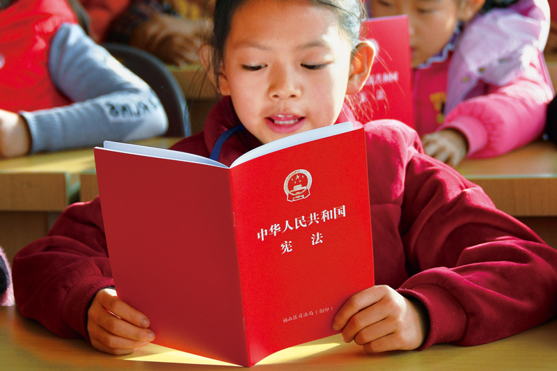 為弘揚(yáng)憲法精神,維護(hù)憲法尊嚴(yán),樹立憲法權(quán)威,2014年11月,十二屆全國(guó)人大常委會(huì)第十一次會(huì)議作出決定,將12月4日設(shè)立為國(guó)家憲法日。圖為2018年第5個(gè)憲法日,山東省煙臺(tái)市福山區(qū)東廳中心小學(xué)學(xué)生在誦讀學(xué)習(xí)憲法。 新華社記者 孫文潭/攝