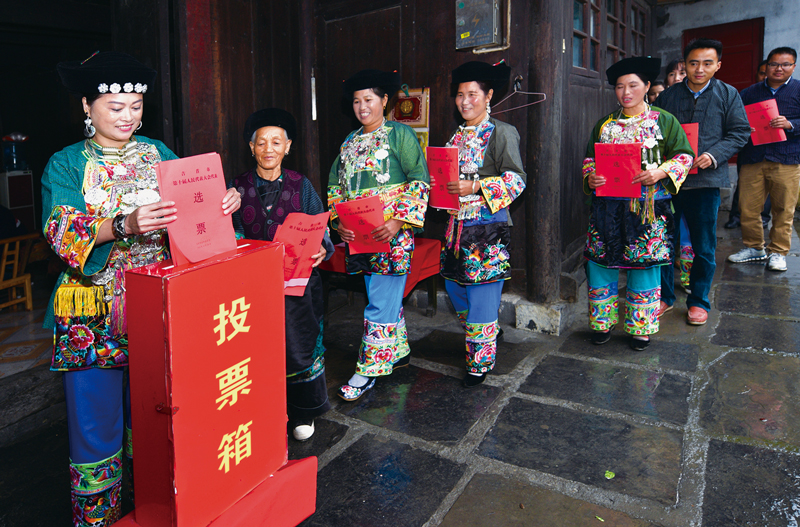 2016年10月28日是湖南省吉首市的市、鄉(xiāng)兩級(jí)人民代表大會(huì)代表?yè)Q屆選舉日。圖為在己略鄉(xiāng)第一選區(qū)龍舞村中心投票點(diǎn),苗家選民正在投票。 姚方/攝