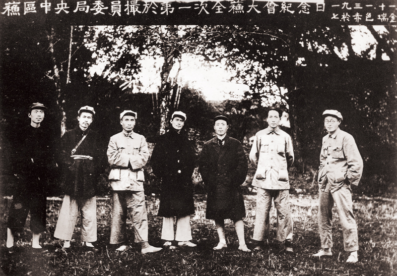 “一蘇大會”選舉產(chǎn)生了由63人組成的中華蘇維埃共和國中央執(zhí)行委員會,中華蘇維埃共和國之最高政權(quán)為全國工農(nóng)兵會議(蘇維埃)的大會,在大會閉會期間,全國蘇維埃臨時中央執(zhí)行委員會為最高政權(quán)機(jī)關(guān),中央執(zhí)行委員會之下組織人民委員會,處理日常政務(wù),并發(fā)布一切法令和決議案。圖為“一蘇大會”期間,中共蘇區(qū)中央局委員的合影。左起依次為顧作霖、任弼時、朱德、鄧發(fā)、項(xiàng)英、毛澤東、王稼祥。 高延智/視覺中國