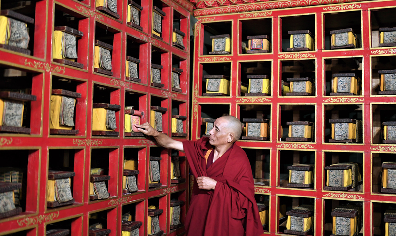 舊西藏政教合一的封建農(nóng)奴制度,不僅嚴(yán)重束縛了西藏生產(chǎn)力的發(fā)展,而且使西藏傳統(tǒng)文化處于封閉萎縮狀態(tài)。西藏民主改革60年來,黨和政府投入巨大人力、財(cái)力和物力,繼承、保護(hù)和弘揚(yáng)藏族優(yōu)秀傳統(tǒng)文化,發(fā)展社會(huì)主義先進(jìn)文化,西藏文化實(shí)現(xiàn)了前所未有的繁榮發(fā)展。上圖為布達(dá)拉宮全景。下圖為布達(dá)拉宮僧人在整理文獻(xiàn)。 新華社記者 普布扎西/攝