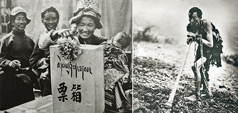 西藏民主改革前,農(nóng)奴只不過是“會(huì)說話的工具”。西藏民主改革徹底廢除了封建農(nóng)奴制度,開啟了西藏從黑暗走向光明、從落后走向進(jìn)步的新時(shí)代,農(nóng)奴成為掌握自己命運(yùn)的主人。1961年,西藏各地開始實(shí)行普選,1965年8月,西藏鄉(xiāng)縣選舉工作完成。左圖為西藏民主改革后翻身農(nóng)奴懷著喜悅的心情選舉自己的當(dāng)家人(漢圖/視覺中國)。右圖為西藏民主改革前戴著鎖鏈勞動(dòng)的農(nóng)奴(新華社發(fā))。