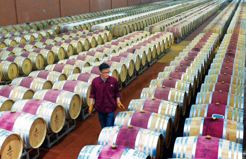 攜手共圓全面小康夢,閩寧對口扶貧協(xié)作結(jié)碩果。閩寧鎮(zhèn)以特色產(chǎn)業(yè)發(fā)展為支撐,培育了光伏、種植、葡萄酒等一批特色產(chǎn)業(yè),為當?shù)厝罕姶蜷_致富門提供了“金鑰匙”。圖為寧夏永寧縣閩寧鎮(zhèn)賀蘭神酒莊的工人在檢查橡木桶。 詹安穩(wěn)/攝