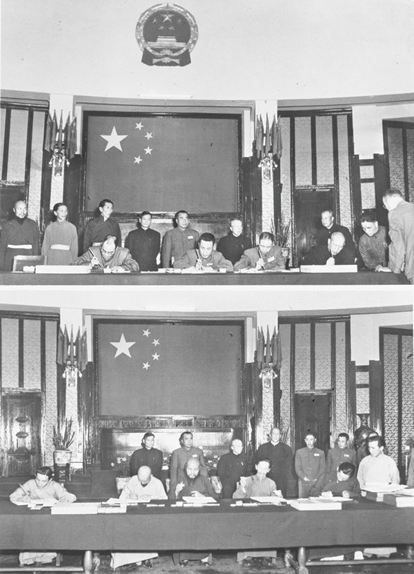 1949年新中國成立后,中國共產(chǎn)黨順應(yīng)西藏人民的強(qiáng)烈愿望,加快推進(jìn)西藏和平解放進(jìn)程。1951年5月23日,中央人民政府與西藏地方政府簽訂《關(guān)于和平解放西藏辦法的協(xié)議》。中央人民政府全權(quán)代表(上圖)和西藏地方政府全權(quán)代表(下圖)在《關(guān)于和平解放西藏辦法的協(xié)議》上簽字。 新華社發(fā)