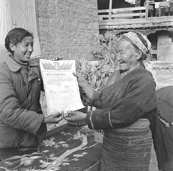 西藏民主改革徹底結(jié)束了舊西藏政教合一的封建農(nóng)奴制度,占西藏人口95%以上的農(nóng)奴和奴隸打碎枷鎖,翻身成為自己的主人。從此,雪域高原人民開始了建設(shè)團(tuán)結(jié)、富裕、文明新西藏的偉大進(jìn)程。圖為1960年拉薩市東城區(qū)蔡公堂鄉(xiāng)擺脫了奴隸枷鎖的老媽媽,以無比興奮的心情接受土地證。 新華社記者 馬鵬萬/攝