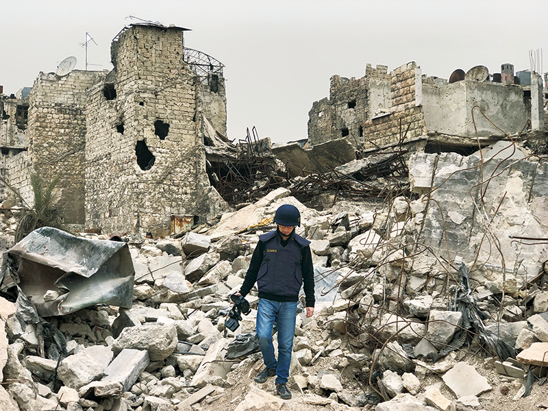 2017年12月22日,新華社記者在敘利亞阿勒頗市區(qū)戰(zhàn)爭造成的廢墟中采訪。 新華社記者 胡馬姆/攝