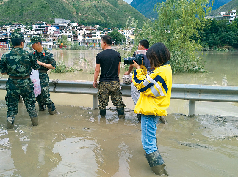 2018年7月15日,新華社記者在遭受強降雨襲擊、造成重大山體滑坡險情的甘肅舟曲縣江頂崖采訪。 新華社記者 張欽/攝
