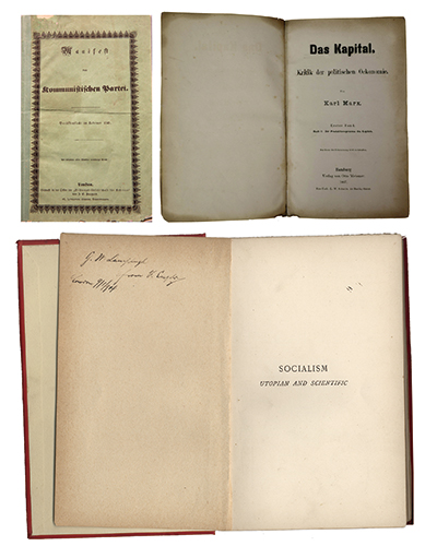 左上圖為1848年《共產(chǎn)黨宣言》德文第一版。右上圖為1867年《資本論》德文第1卷第一版。下圖為恩格斯的題字贈書《社會主義從空想到科學(xué)的發(fā)展》,1892年英文版。 中央黨史和文獻研究院供圖