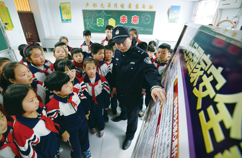 “全民國家安全教育日”來臨之際,各地學校開展國家安全知識教育活動,為學生們講解國家安全相關法律法規(guī),提高學生們的國家安全意識。圖為2018年4月13日,河北省邯鄲市火磨派出所民警在火磨小學為學生們講解國家安全相關知識。 新華社發(fā) 郝群英/攝