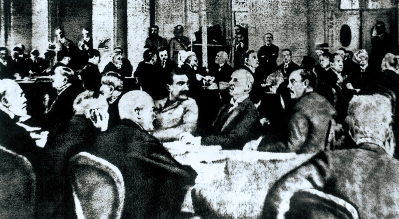 近代以來(lái),帝國(guó)主義列強(qiáng)的侵略使中國(guó)逐步淪為半殖民地國(guó)家,帝國(guó)主義和中華民族的矛盾成為近代中國(guó)社會(huì)的主要矛盾之一。1919年1月,第一次世界大戰(zhàn)戰(zhàn)勝國(guó)在法國(guó)巴黎召開(kāi)和會(huì),把持和會(huì)的英法美等列強(qiáng)無(wú)視中國(guó)也是戰(zhàn)勝國(guó)之一,不顧中國(guó)民眾呼聲,竟然決定將戰(zhàn)敗國(guó)德國(guó)在中國(guó)山東的權(quán)益轉(zhuǎn)讓給日本。在巴黎和會(huì)中,中國(guó)政府的外交失敗,激起了中國(guó)民眾的強(qiáng)烈不滿,從而引發(fā)了五四運(yùn)動(dòng)。圖為巴黎和會(huì)會(huì)場(chǎng)。 北京新文化運(yùn)動(dòng)紀(jì)念館供圖