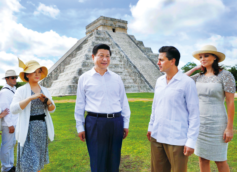 2013年6月6日,為推進中墨兩個文明古國的文化交流,國家主席習近平應(yīng)培尼亞總統(tǒng)邀請參觀奇琴伊察瑪雅文明遺址。 新華社記者 饒愛民/攝