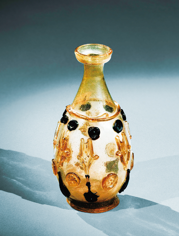 1987年,在中國陜西的法門寺,地宮中出土了20件美輪美奐的琉璃器,這是唐代傳入中國的東羅馬和伊斯蘭的琉璃器。圖為法門寺地宮中出土的盤口細頸貼塑淡黃色琉璃瓶。 法門寺博物館供圖