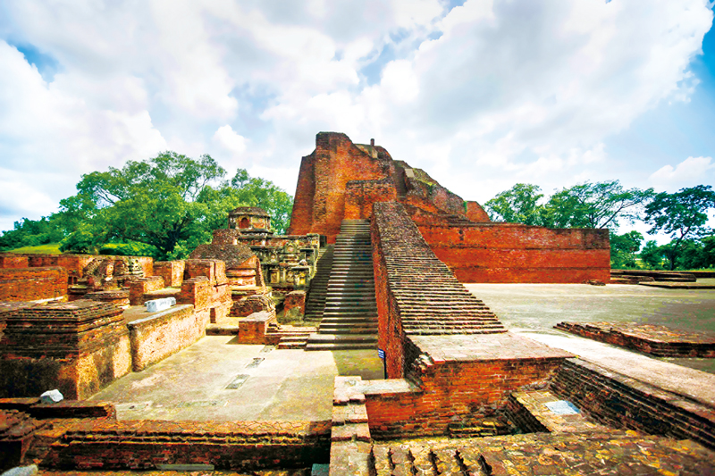 玄奘,唐代著名高僧,中外文化交流杰出使者。他歷經(jīng)艱辛到印度取經(jīng),回國(guó)后主要從事佛經(jīng)翻譯,譯經(jīng)數(shù)量占到唐代譯經(jīng)總卷數(shù)的一半以上,所著的《大唐西域記》一書(shū),為研究中古時(shí)期中亞、南亞諸國(guó)的歷史、地理、宗教、文化等提供了重要資料。上圖為山西省稷山縣青龍寺“玄奘取經(jīng)圖”壁畫(huà)(局部)(新華社記者 馬毅敏/攝)。下圖為根據(jù)《大唐西域記》確認(rèn)的印度那爛陀寺遺址(新華社記者 鄭煥松/攝)。