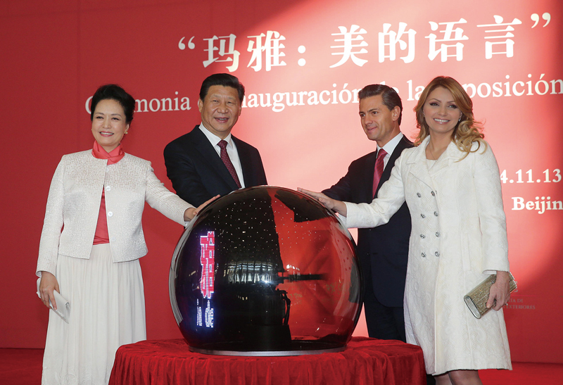 2014年11月13日,國家主席習近平同墨西哥總統(tǒng)培尼亞共同出席在國家博物館舉行的“瑪雅:美的語言”文化展開幕式。這是習近平和夫人彭麗媛與培尼亞夫婦一同為展覽剪彩。 新華社記者 劉衛(wèi)兵/攝