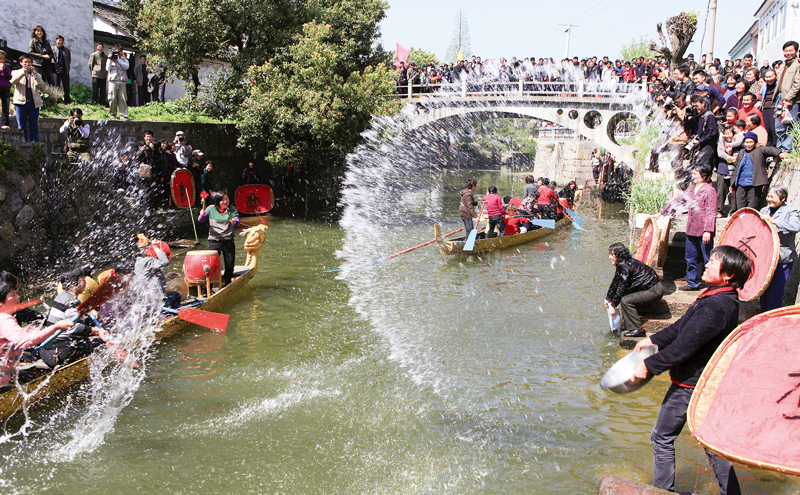 浙江“千萬工程”以治理好涉及千家萬戶的“關(guān)鍵小事”為切入口,掀起“垃圾革命”、“污水革命”、“廁所革命”,使廣大鄉(xiāng)村迎來翻天覆地的變化,再現(xiàn)天藍(lán)水清的美麗景象。圖為湖州市德清縣下渚湖街道塘涇村的村民舉行潑水祈豐年活動。 浙江省農(nóng)辦供圖