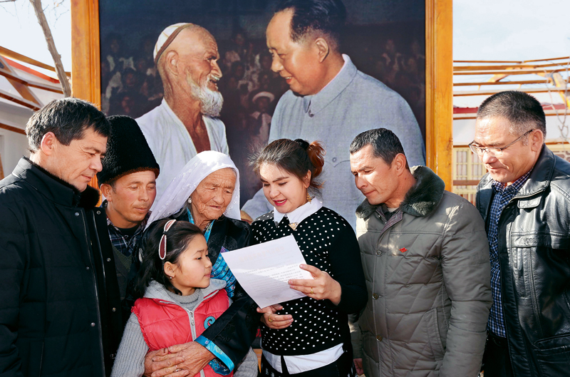 20世紀50年代,新疆于田縣農(nóng)民庫爾班·吐魯木受到毛澤東兩次接見,人們親切地稱他為“庫爾班大叔”。托乎提汗是庫爾班的長女,她在給習(xí)近平總書記的信中表達了熱愛祖國、熱愛新疆、熱愛家鄉(xiāng)的愿望。2017年1月11日,習(xí)近平總書記回信,向她和家人及鄉(xiāng)親們送上祝福,并希望各族群眾像石榴籽一樣緊緊抱在一起,在黨的領(lǐng)導(dǎo)下共同創(chuàng)造新疆更加美好的明天。圖為2017年1月13日,托乎提汗一家人圍在一起閱讀習(xí)近平總書記的回信。 新疆日報社記者 宋君/攝