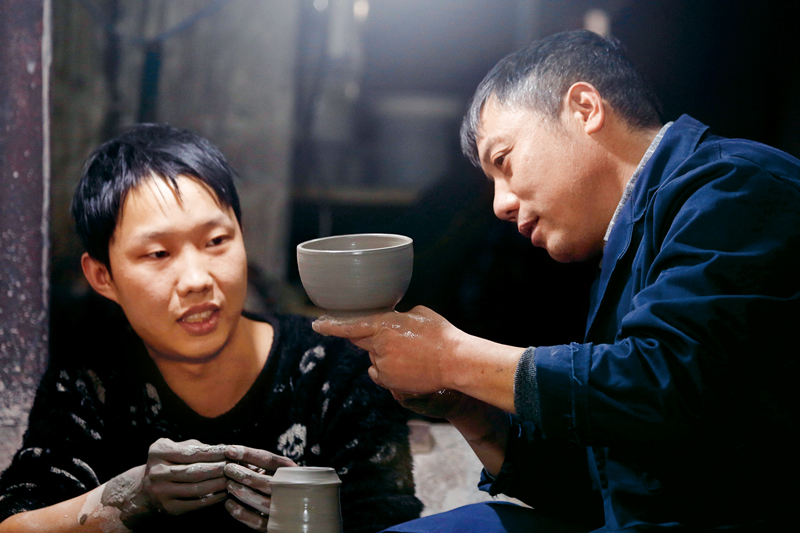 推動鄉(xiāng)村優(yōu)秀傳統(tǒng)文化創(chuàng)造性轉化、創(chuàng)新性發(fā)展,是助力鄉(xiāng)村振興的重要方式之一。近年來,河南省平頂山市寶豐縣不斷加大汝瓷文化產(chǎn)業(yè)發(fā)展力度,助力鄉(xiāng)村振興。圖為2018年12月19日,河南省寶豐縣非物質文化遺產(chǎn)(汝瓷燒制技藝)代表性傳承人宋延賓(右)在教授徒弟拉坯。 中新社發(fā) 何五昌/攝